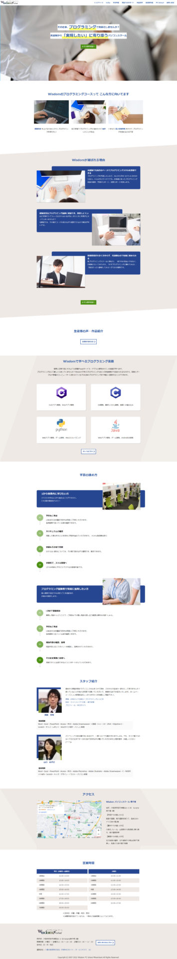 Wisdomパソコンスクールでは、デザインで必要な実践的スキル、Photoshopやillustratorなどの使い方だけではなく、HTML/CSS/JavaScriptなどWEBサイトをつくるために必要なコーディングのスキルも学べます。 また、店舗型なので対人かつ個別で細かく対応し、期間に縛られず自分のペースで学んでいくことができます。